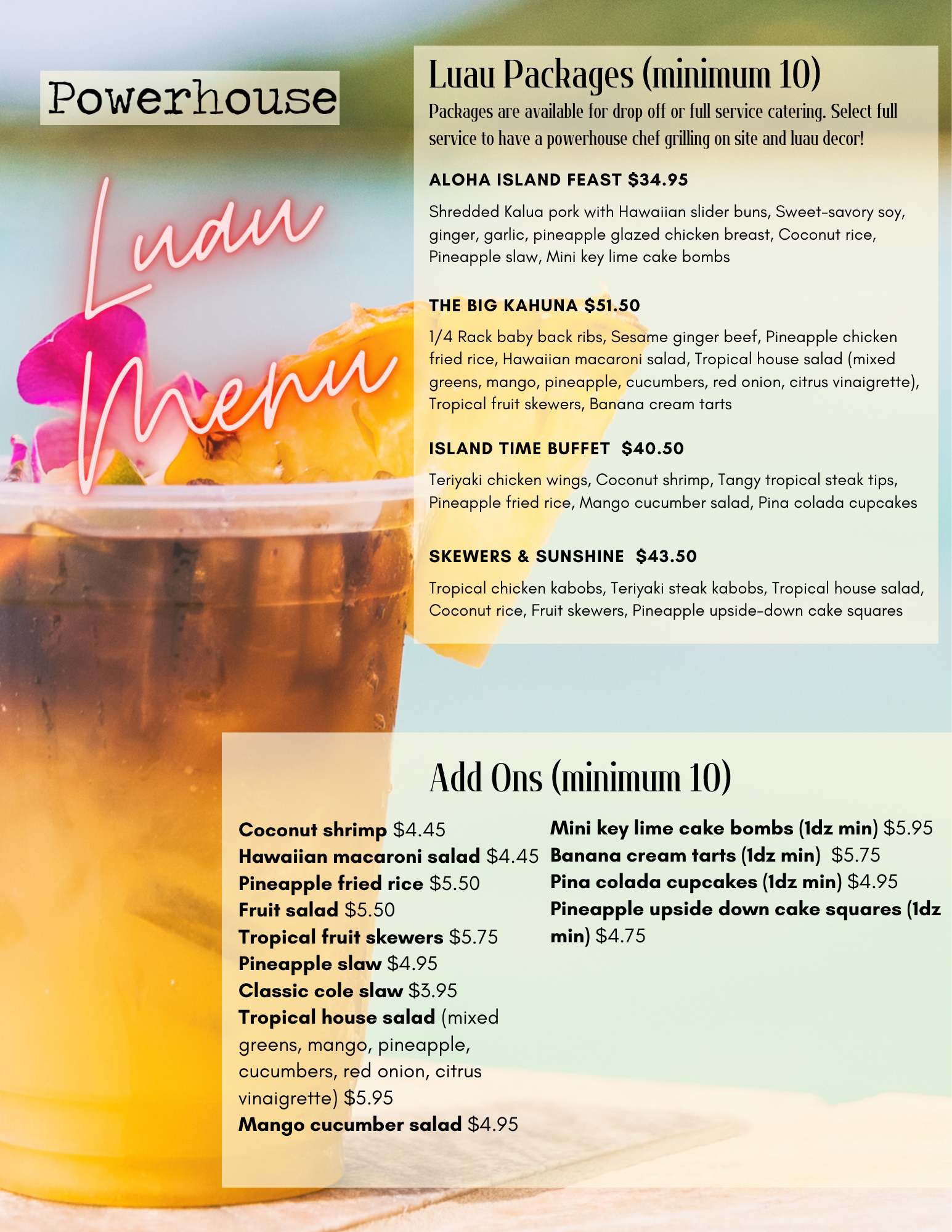 Close your eyes. You smell coconut shrimp, teriyaki steak kabobs sizzling on the grill, pineapple fried rice, and fresh tropical fruit skewers — and then someone hands you a pina colada cupcake. That's a Powerhouse Luau. We bring the full Hawaiian experience to your backyard, your venue, or your office across Greater Boston — complete with our Powerhouse chef grilling on site and authentic luau décor to set the scene. From the Aloha Island Feast to the Big Kahuna, every dish is made from scratch in our Woburn kitchen using fresh, vibrant tropical flavors that actually taste like a vacation. Packages start at $34.95 per person, drop-off or full service available.